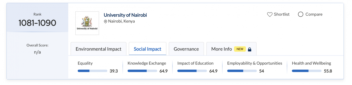 The University of Nairobi achieved an overall global rank of 1081–1090. This places UoN firmly among the world’s universities making significant strides in sustainability. Within Africa, UoN ranked 35th out of 83 institutions, and in Sub-Saharan Africa, it secured 13th place. These results highlight UoN’s growing influence as a regional leader in sustainability-focused education and research. Most notably, UoN is ranked position 1 in Kenya, ahead of Kenyatta University and Moi University.